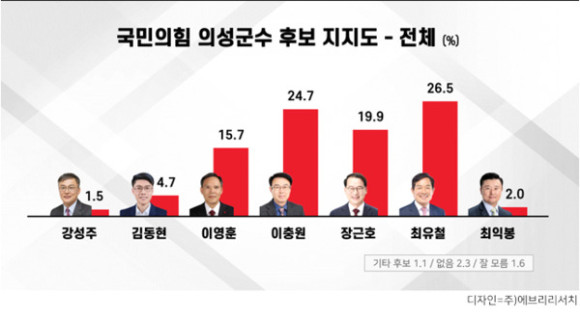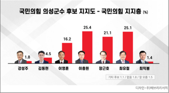|  | | | ↑↑ 국민의힘 지지층만 따로 분석했을 때는 이충원 후보(25.4%)과 최유철 후보(25.1%)가 단 0.3%p 차이로 초박빙 접전을 벌이고 있다. | | ⓒ 의성군민신문 | |